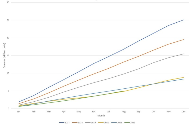 Chúng ta có thể thấy tổng kết hàng tháng số lượng máy ảnh xuất xưởng & vận chuyển từ CIPA (Hiệp hội báo chí quốc tế về công nghệ hình ảnh) trong 5 năm qua như biểu đồ dưới. Bên cạnh việc số lượng các lô hàng không đều và giảm dần, có vẻ như năm 2017 là một năm tốt hơn nhiều so với 2021. Đó là, 25 triệu chiếc camera đã được xuất xưởng, so với chỉ 8,4 triệu chiếc năm ngoái. Có lẽ, trước sự ngạc nhiên của mọi người, năm 2022 (đường màu xanh lá cây) thực sự tồi tệ hơn năm vừa qua.