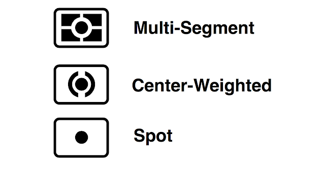 Mỗi hãng sẽ có những kí hiệu về chế độ đo sáng khác nhau nhưng bản chất thì không thay đổi và được chia ra thành 3 kiểu đo sáng: Đo sáng toàn khung (Evaluative/Matrix Metering), Đo sáng điểm (Spot Metering), Đo sáng trung tâm (Center-Weighted Metering)