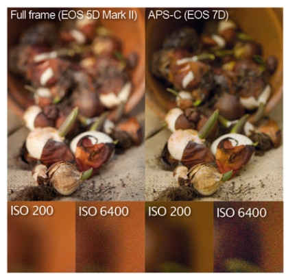 Khác biệt đầu tiên của cảm biến Full frame là có diện tích thu bắt sáng lớn hơn, trong cùng điều kiện ánh sáng thì cảm biến Full frame thu được nhiều ánh sáng và ảnh rõ nét hơn, xử lí ISO ít bị nhiễu chi tiết như cảm biến Crop hay nhỏ hơn.