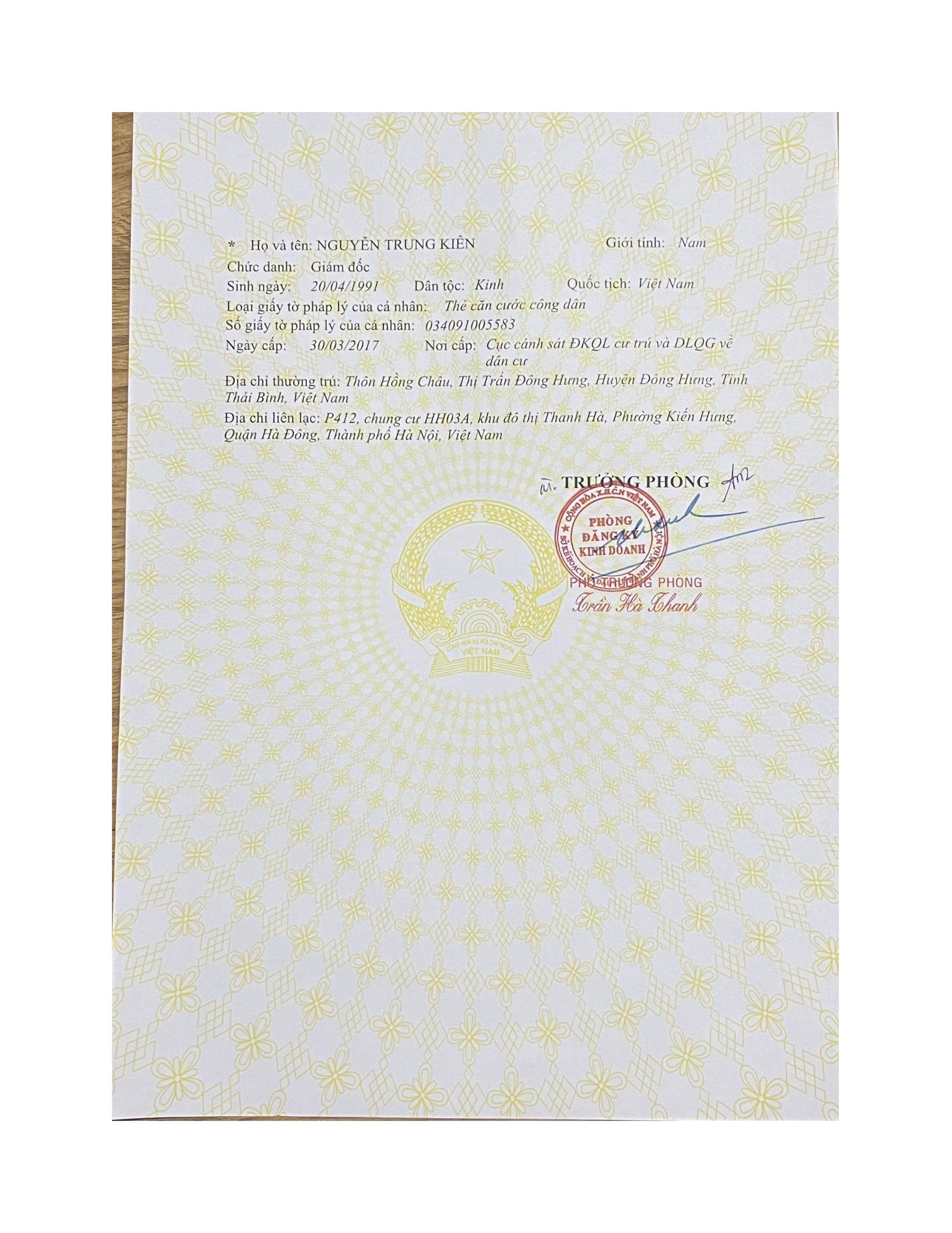 Người đại diện theo pháp luật của công ty: Họ và tên: Nguyễn Trung Kiên - Chức danh: Giám đốc