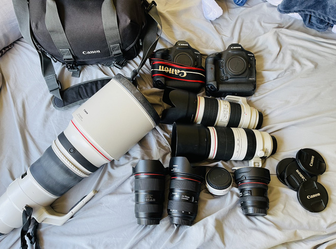 Tiếp theo là nhiếp ảnh gia Simon Bruty, làm việc cho ấn phẩm Sports Illustrated. Chia sẻ với PopPhoto, Simon cho biết anh muốn có một bộ gear "nhẹ nhàng", cho phép anh này di chuyển từ nơi này tới nơi khác một cách dễ dàng. Tuy vậy, với tính chất công việc của mình, Simon vẫn sẽ phải trang bị tới... 6 body Canon EOS-1D series, Canon EOS R5 kèm theo hàng loạt lens L của Canon và hàng tá các phụ kiện không thể thiếu cho nhiếp ảnh gia như tripod, monopod, SSD gắn ngoài, thẻ nhớ, pin...