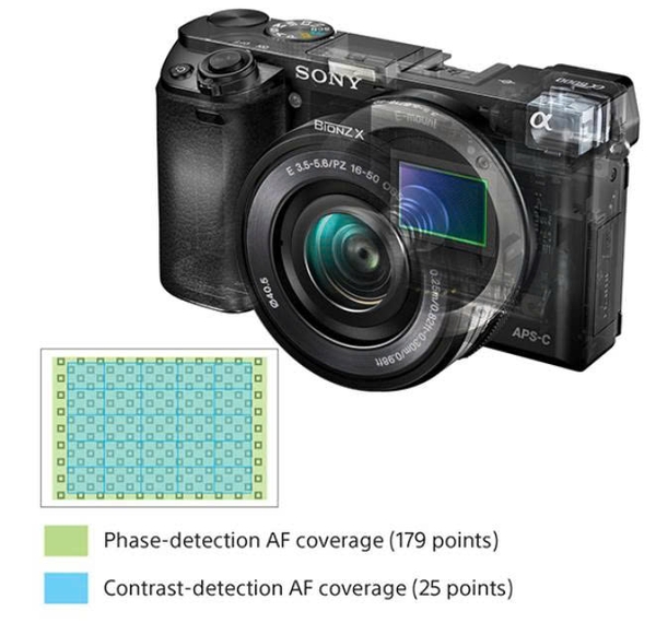 Sony A6000 sử dụng cảm biến độ phân giải cao 24,3 MP đã được cải tiến, với 179 điểm lấy nét theo pha trên chip bao phủ gần như toàn bộ diện tích của cảm biến. Mặc dù điều này thoạt nghe có vẻ không lớn, nhưng sự khác biệt thực sự khá lớn khi so sánh với NEX-6 – phạm vi bao phủ rộng hơn của các điểm lấy nét không chỉ giúp lấy nét dễ dàng và nhanh hơn với chủ thể nằm ngoài trung tâm mà còn cho phép theo dõi các đối tượng chuyển động tốt hơn và chính xác hơn, nhờ vào số lượng các điểm lấy nét lớn hơn nhiều.