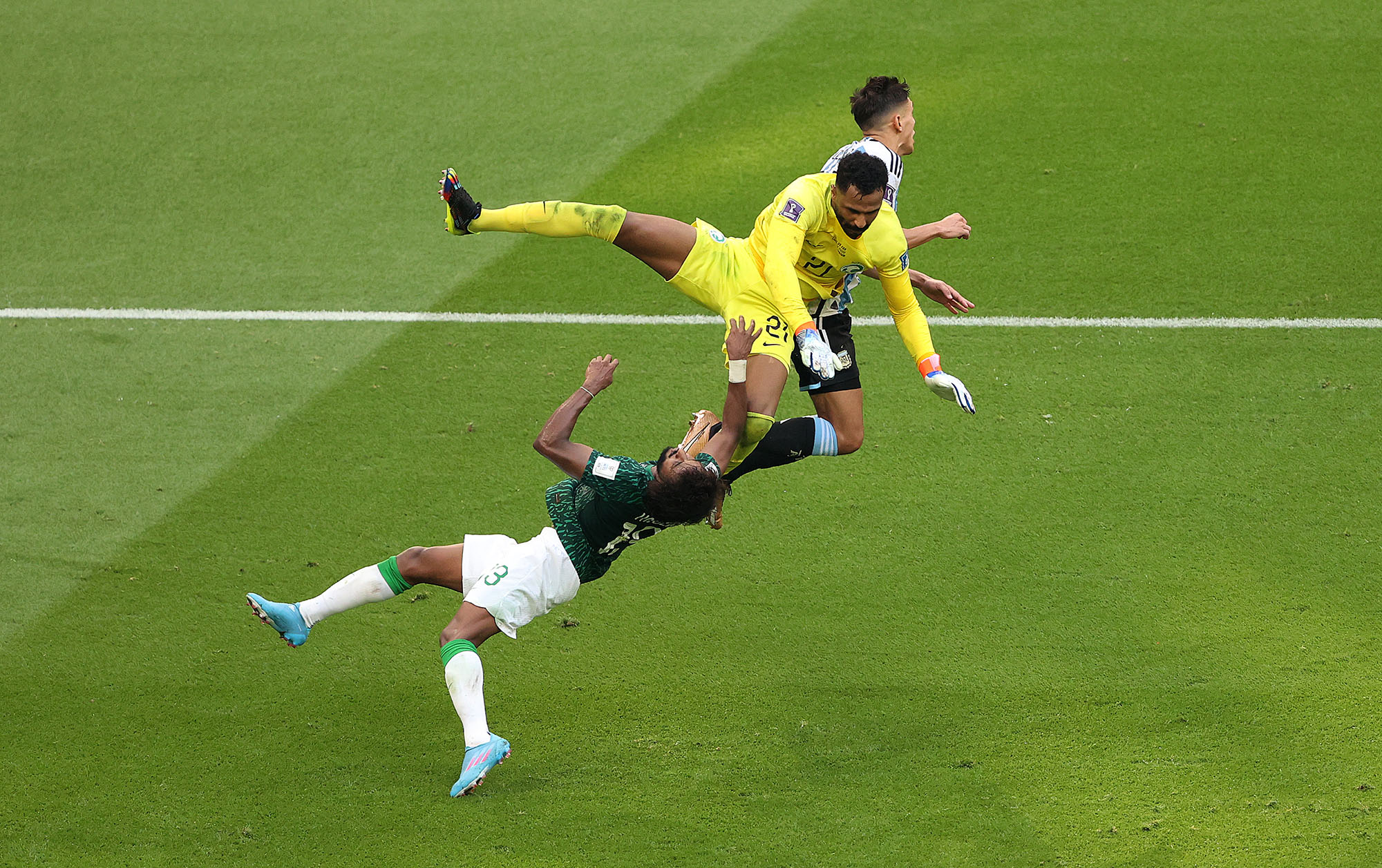 Mohammed Al-Owais (trái) của Ả Rập Xê Út va chạm với đồng đội Yasser Al-Shahrani trong trận đấu bảng C Giải vô địch bóng đá thế giới Qatar 2022 giữa Argentina và Ả Rập Xê Út tại sân vận động Lusail vào ngày 22 tháng 11.