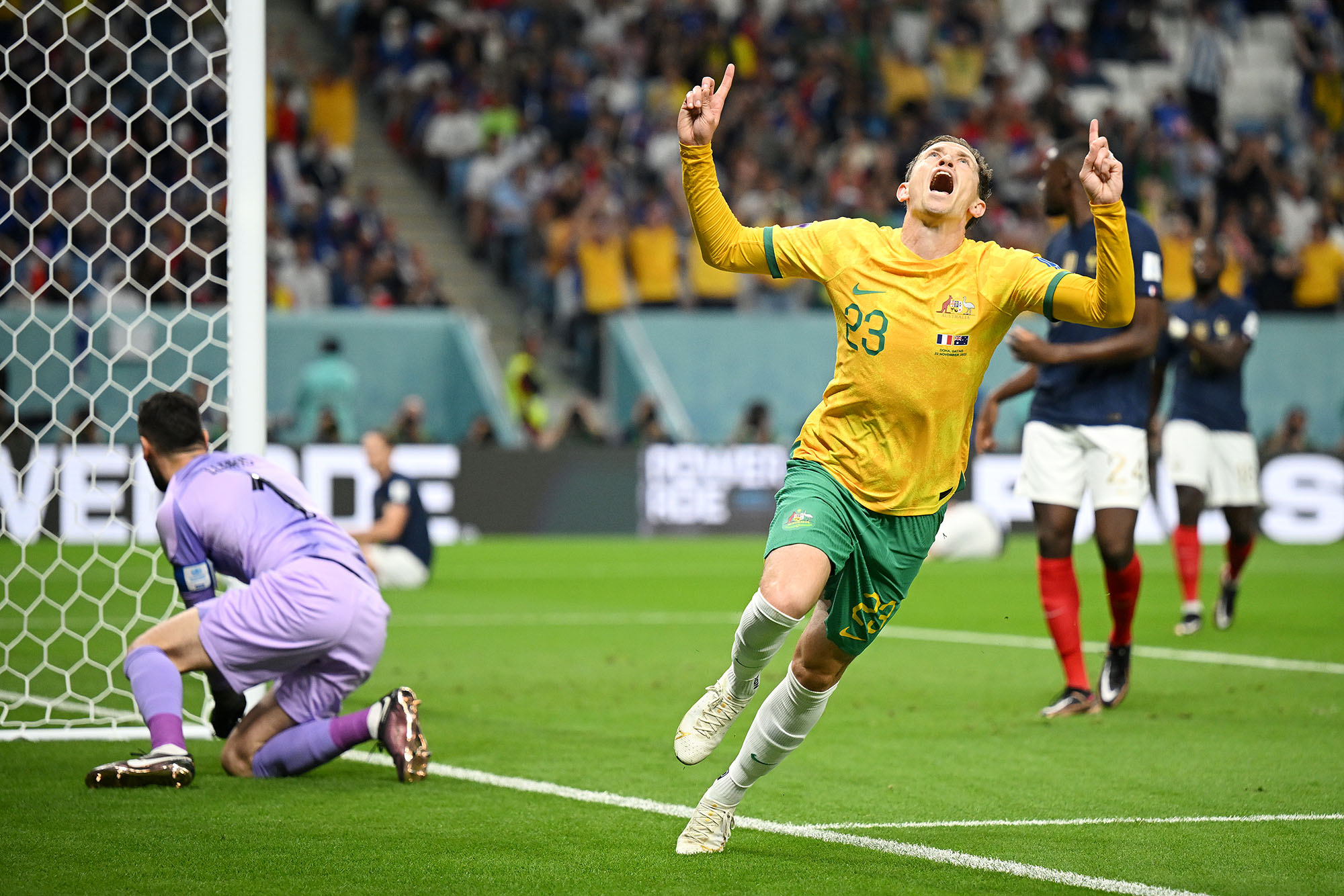 Craig Goodwin của Úc ăn mừng khi ghi bàn thắng đầu tiên cho đội bóng của mình trong trận đấu bảng D Giải vô địch bóng đá thế giới Qatar 2022 giữa Pháp và Úc tại Sân vận động Al Janoub vào ngày 22 tháng 11.