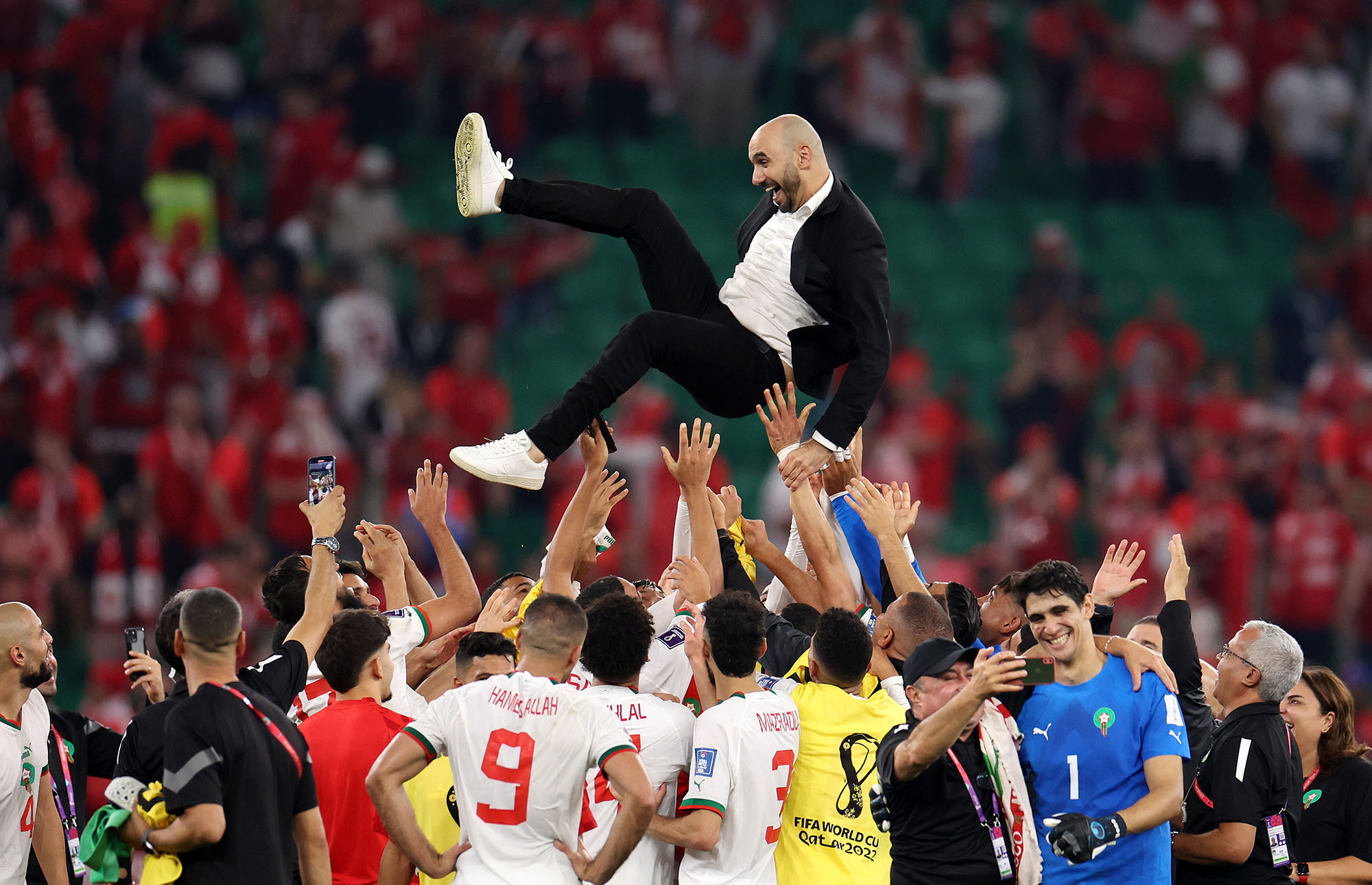 Walid Regragui, Huấn luyện viên trưởng của Ma-rốc, ăn mừng cùng đội sau khi họ vượt qua vòng loại trực tiếp trong trận đấu Bảng F Giải vô địch bóng đá thế giới Qatar 2022 giữa Canada và Ma-rốc tại Sân vận động Al Thumama vào ngày 01 tháng 12 năm 2022.