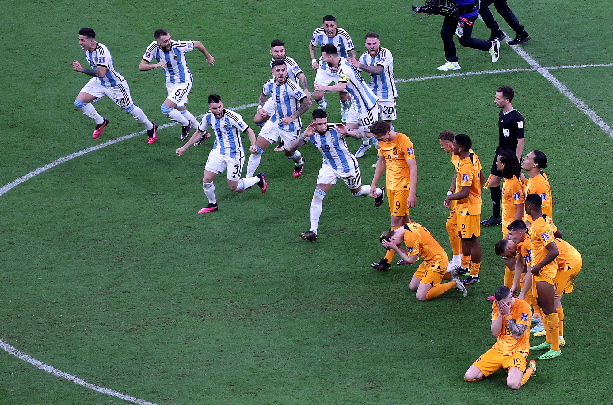 Các cầu thủ Argentina ăn mừng sau chiến thắng trong loạt sút luân lưu khi các cầu thủ Hà Lan phản ứng trong trận tứ kết Giải vô địch bóng đá thế giới Qatar 2022 giữa Hà Lan và Argentina tại Sân vận động Lusail vào ngày 09 tháng 12 năm 2022.