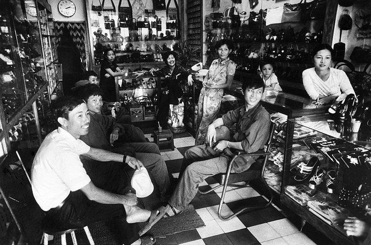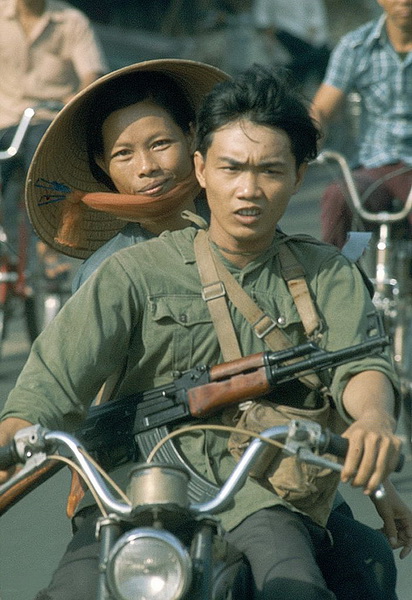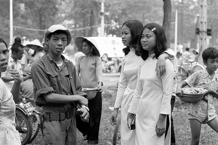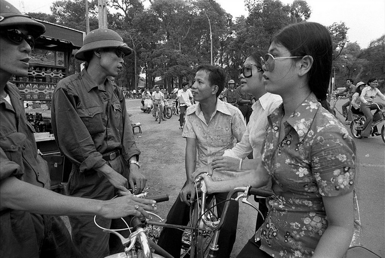 Các cô cậu lính giải phóng quân đang vui vẻ tâm tình cạnh một tiệm nước giải khát ở đường phố Sài Gòn