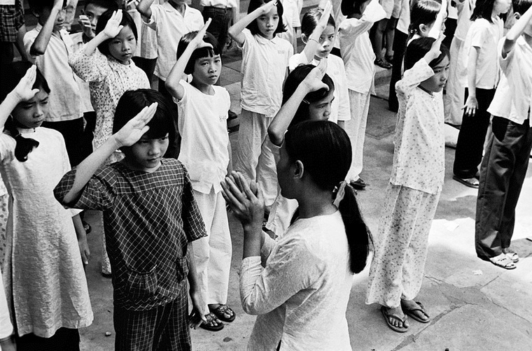 Các em học sinh đang học tập về cách chào cờ mới của chế độ mới