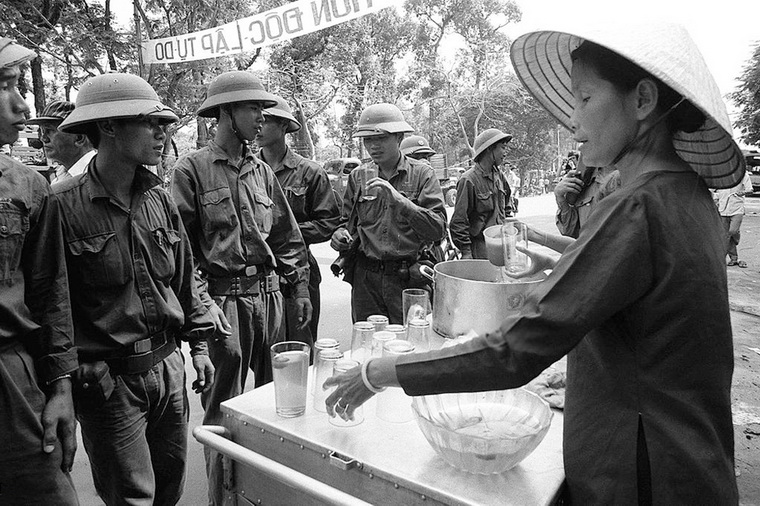 Người dân đang tiếp tế nước uống miễn phí cho các lính Giải phóng