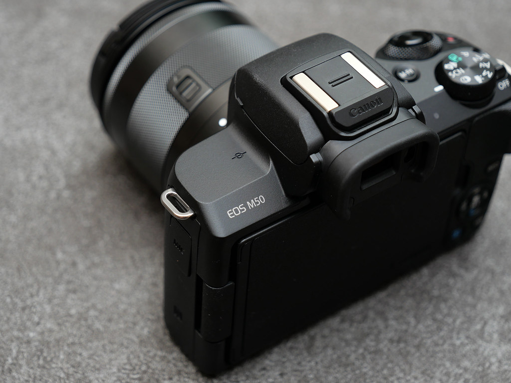 Cũng giống như X-A7, Canon M50 cũng có màn hình cảm ứng xoay lật 270 độ tuy nhiên máy lại có ống ngắm điện tử. Máy được trang bị jack cắm mic 3.5mm. Khả năng quay video 4K 24 khung hình/ giây, 1080 60 khung hình / giây. Màu ảnh của Canon cực kì đẹp, được đánh giá là hãng máy ảnh có màu ảnh đẹp nhất. Thiết kế của máy nhìn khá giống những chiếc DSLR của hãng nhưng không hề nặng. Bên cạnh đó, báng cầm to hơn so với X-A7 đem lại cảm giác cầm nắm dễ dàng và thoải mái hơn